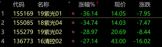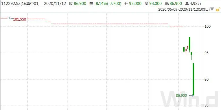 Wind资讯统计显示,11月11日,逾10只信用债出现较大的调整,截至当日收盘“19紫光01”、“18紫光04”均下跌超过34%;CFETS也显示,截至目前,“19永煤CP003”和“20永煤SCP007”的成交净价分别只有6.56元和9.51元。