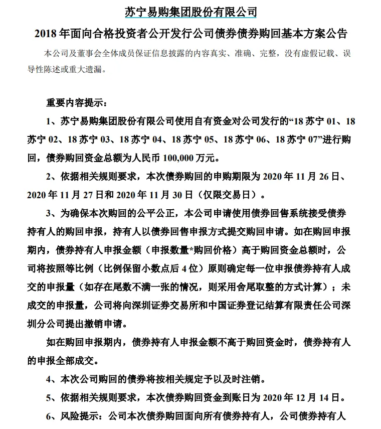苏宁易购周四晚间公告称,使用自有资金对公司发行的“18苏宁01”、“18苏宁02”、“18苏宁03”、“18苏宁04”、“18苏宁05”、“18苏宁06”、“18苏宁07”进行购回,债券购回资金总额为10亿元。本次债券购回的申购期限为11月26日、11月27日和11月30日(仅限交易日)