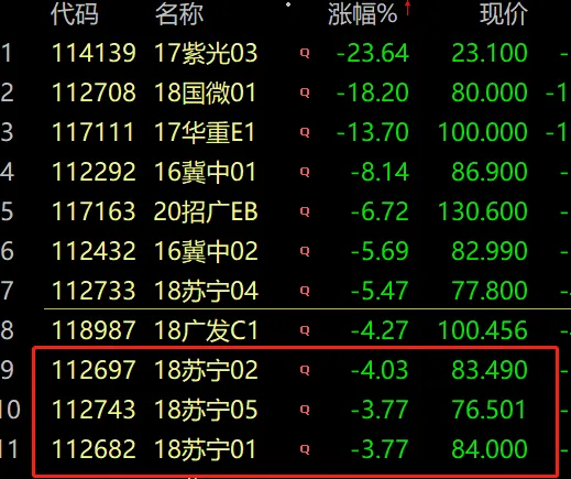 悲观情绪蔓延至整个信用债市场。苏宁易购集团债券集体下跌,“18苏宁01”跌超5%,“18苏宁02”、“18苏宁07”和“18苏宁05”跌超3%,“18苏宁04”和“18苏宁03”均跌超2%。