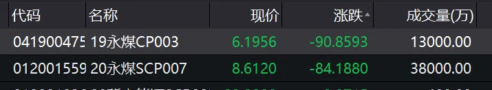 数据显示,12日,“19永煤CP003”最新净价跌逾90%报6.19元,“20永煤SCP007”净价跌874%报8.61元。