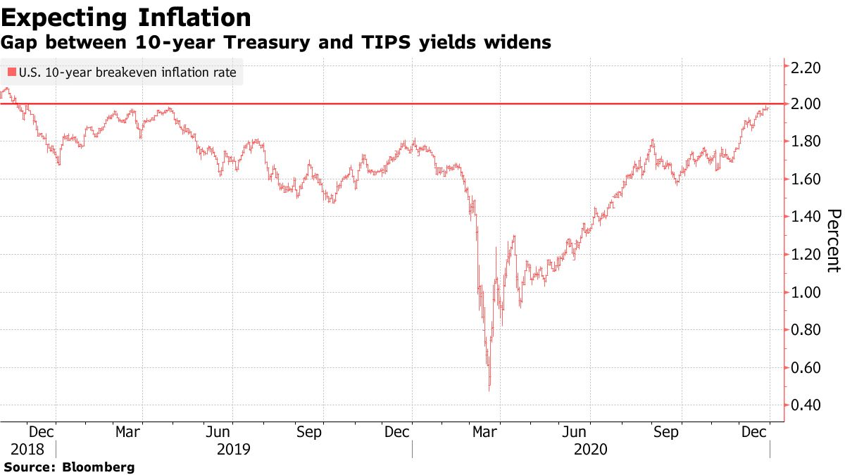 外媒收集的数据显示,盈亏平衡通胀率周二(12月29日)报1.981%,周一曾触及1.992%,为2018年12月以来的最高水平。盈亏平衡通胀率是同样期限的美国国债和通胀保值债券TIPS之间的息差,它通常被视为衡量市场通胀预期的宽泛指标。
