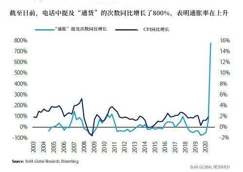 由于企业现在都公开表示对不断飙升的成本感到恐慌,他们更加理所当然地将成本转移给消费者。美国银行对此作出结论,从绝对基础上看,提及“通胀”的次数从2011年起飙升至接近历史高点,表明未来至少将出现“暂时性的”恶性通胀。