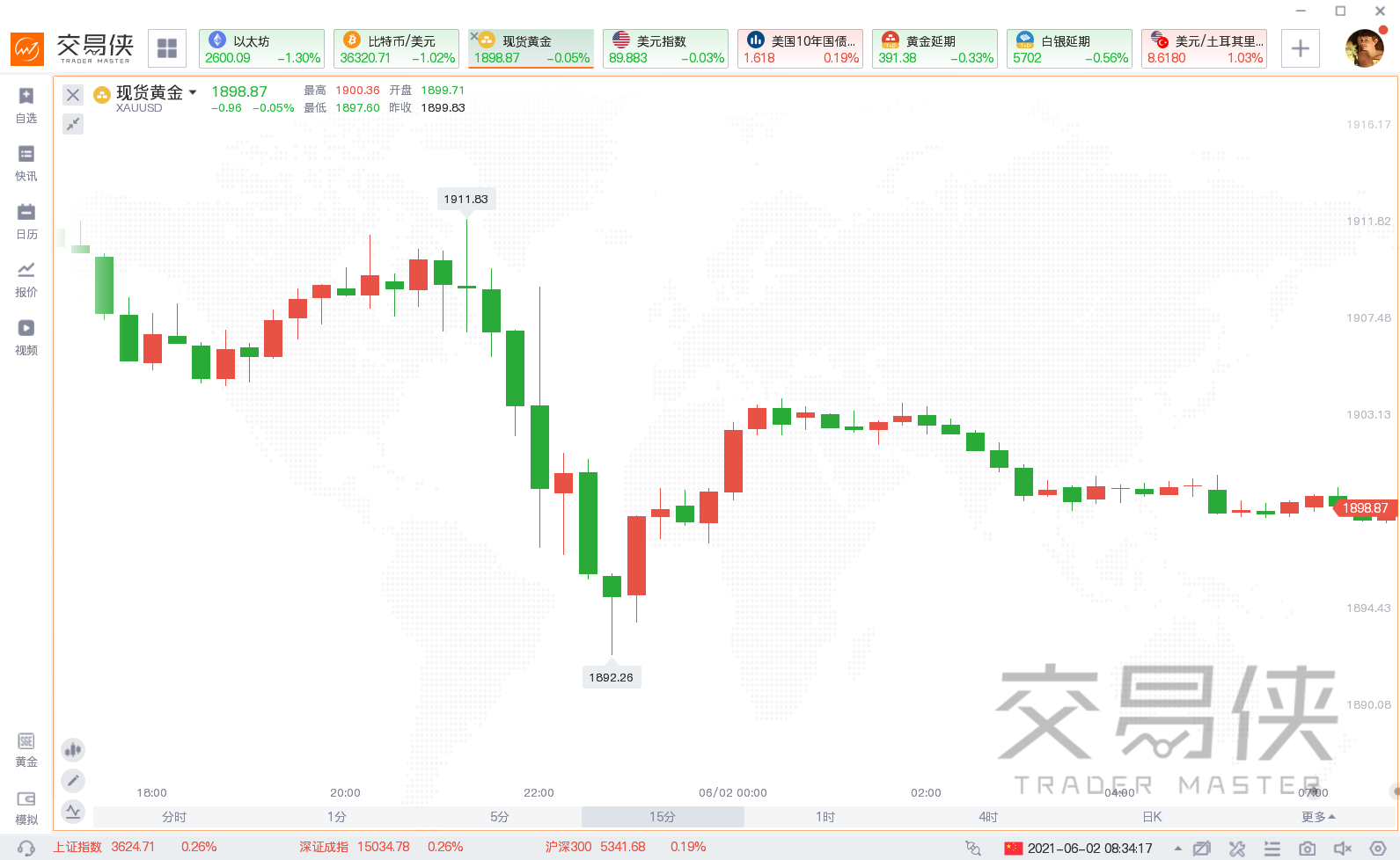 COMEX最活跃黄金期货合约北京时间6月1日22:00一分钟内买卖盘面瞬间成交2741手,交易合约总价值5.22亿美元。到22:04,该合约一分钟内买卖盘面瞬间再成交2030手,交易合约总价值3.86亿美元。现货黄金随之短线下挫10美元,失守1900美元/盎司。22:45,一分钟内买卖盘面瞬间又成交2013手,交易合约总价值3.81亿美元。